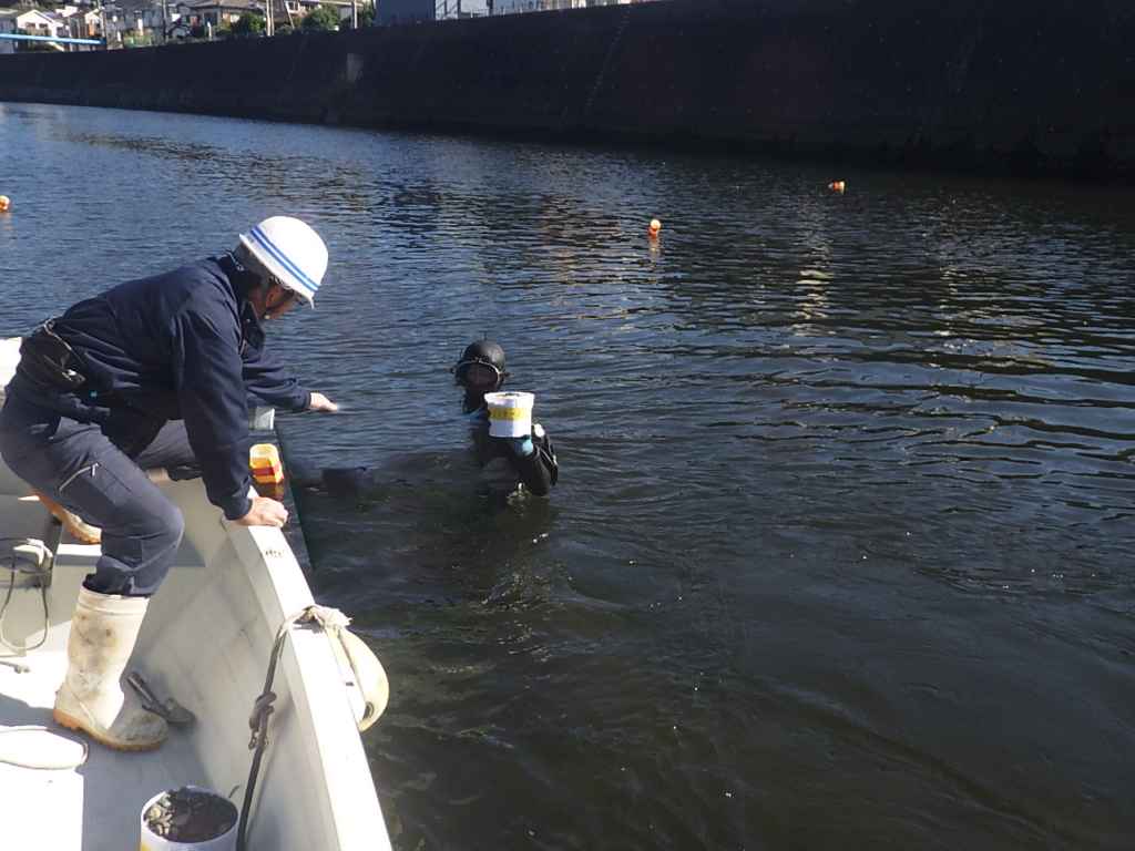 胴長等で川の中に入り土砂を採取する事が水深が深く困難だった為、ダイバーさんに潜水して採取してもらいました。