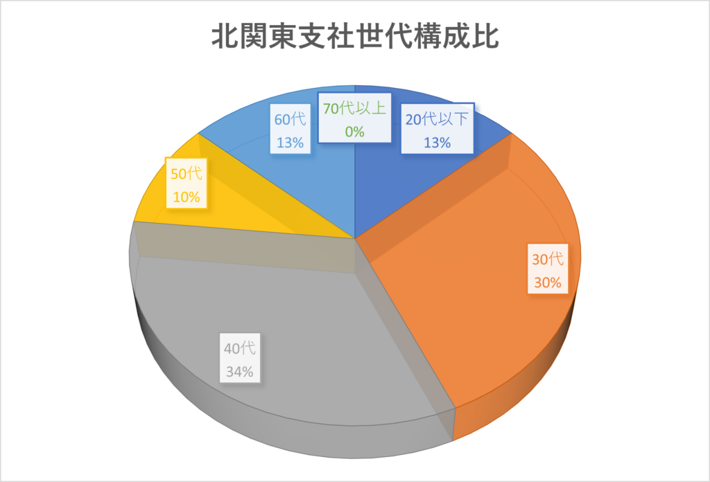 世代別構成比は30代、40代が中心となって活躍しています。若い世代も増えてきており、これから益々発展する拠点です。
